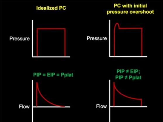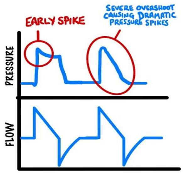 lung compliance에 비해 flow가 빠른 속도로 들어오면서, inspiration 시작과 동시에 순간적으로 pressure가 증가하여 툭 튀어나오는 그래프가 나타난다. Flow rate를 낮추기 위해 inspiratory rise time을 조정하거나, TV을 낮출 수 있다.
