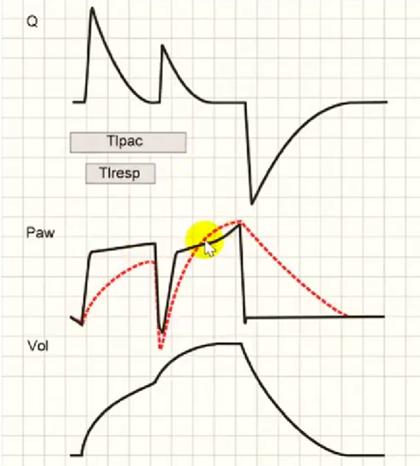 위 그래프의 경우는 expiration 중 self drive가 발생해서 한번 더 inspiration이 시작된 경우이다. expiration이 거의 진행되지 않은 상태로 inspiration이 한번 더 걸렸기 때문에, 폐 내부에 volume이 남아있는 상태로 두 번째 inspiration을 하게 된다. 그로 인해 두 번째 inspiration 시에는 동일한 속도의 flow를 주지 못함을 flow 그래프에서 확인할 수 있다.(같은 양의 flow를 주면 volume으로 인해 PAW가 증가한다. 뒤집어 말하면 같은 상황에서 volume control의 경우는 두 번째 inspiration 시 pressure가 상승한다).